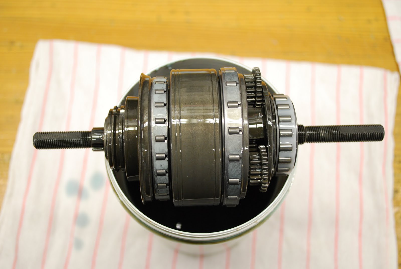 Apply grease to the bearings and clutch rollers. I also inject 3cc or 4cc of the special Shimano oil (ice cream topping) between the gears before putting everything back together.
