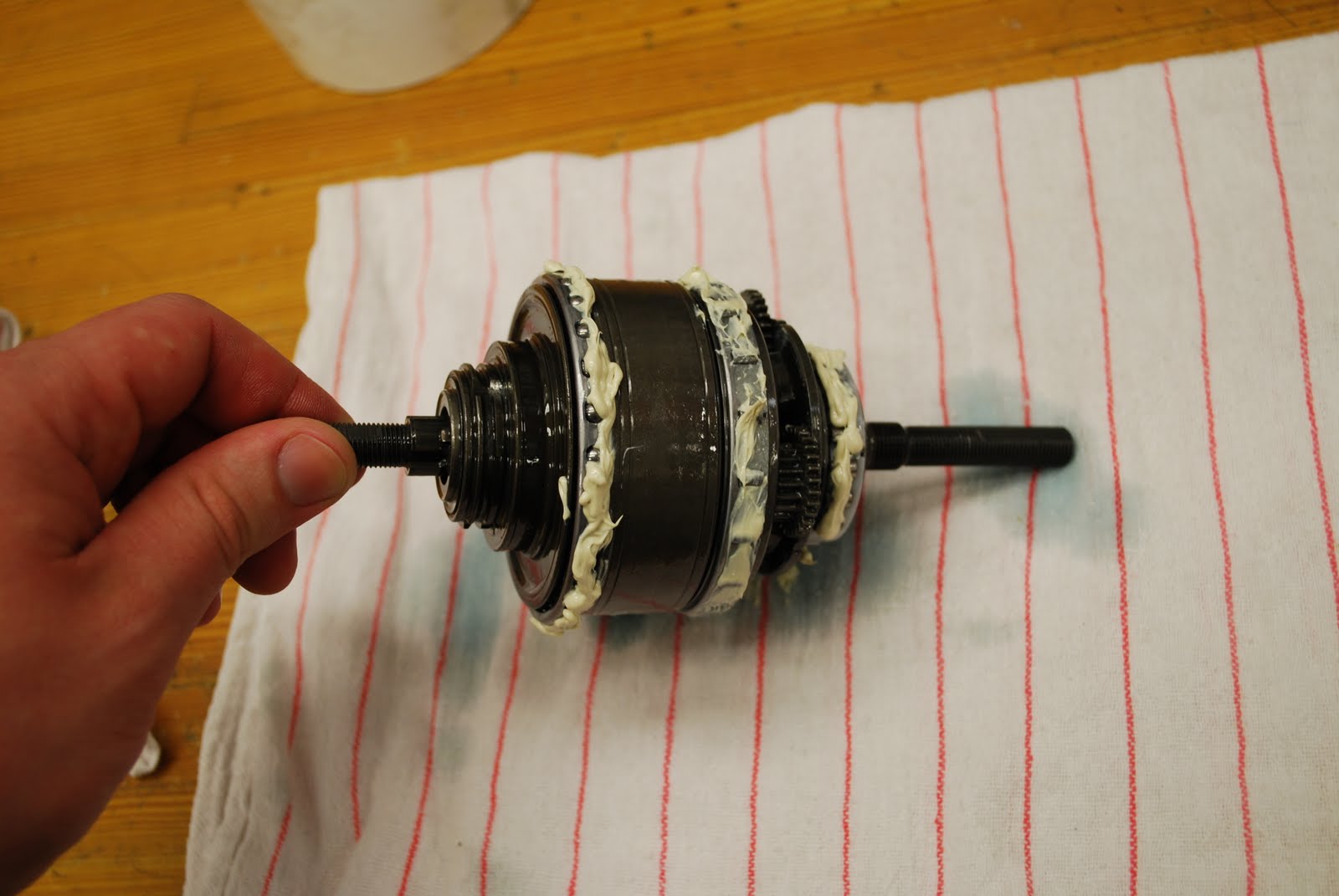 Seat the axle in the dropouts and fasten both axle nuts. Align belt if applicable. Check all the gears to make sure there are still 8 of them. If there aren't as many as when you started, something went wrong. Shift into 4th gear and use cable tension to align the two yellow marks in the window.After performing this service, the hub felt like it shifted faster and more crisply, especially in the extreme cold. One of our year-round commuting employees, Ben, who uses the same hub described the overhaul to make the shifting "less gummy and more direct. It gives me all of it," he concluded. I'm not really sure what that last part means, but it sounds pretty positive.